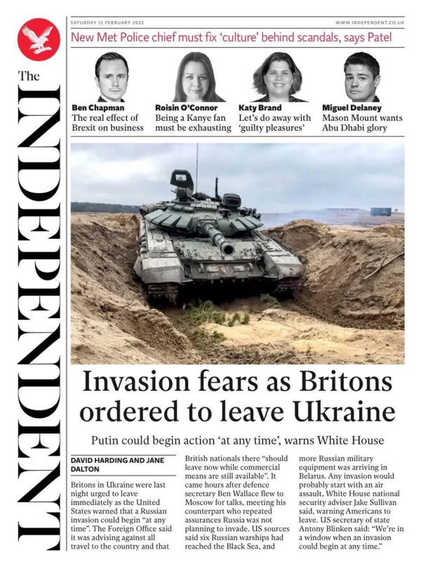 «Британцам сказали уехать из Украины. Россия может вторгнуться через пару дней, предупреждают американцы», — говорится на обложке Times