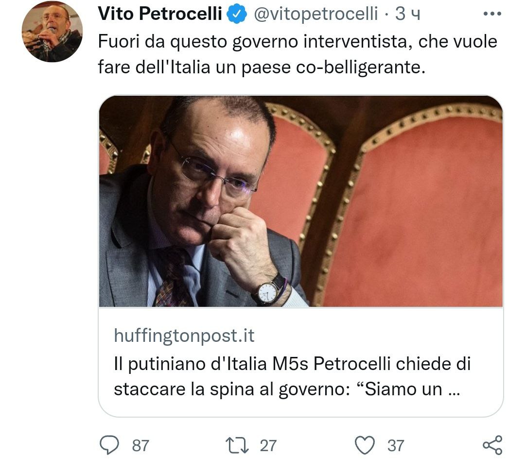 «Я думаю, что для “Движения пяти звезд” пришло время вывести министров и заместителей министров из правительства Драги (Марио Драга — глава Совета министров). Это правительство решило отправить оружие Украине, фактически сделав Италию воюющей страной. Какой смысл подтверждать доверие к интервенционистскому правительству?» — заявил Петрочелли.