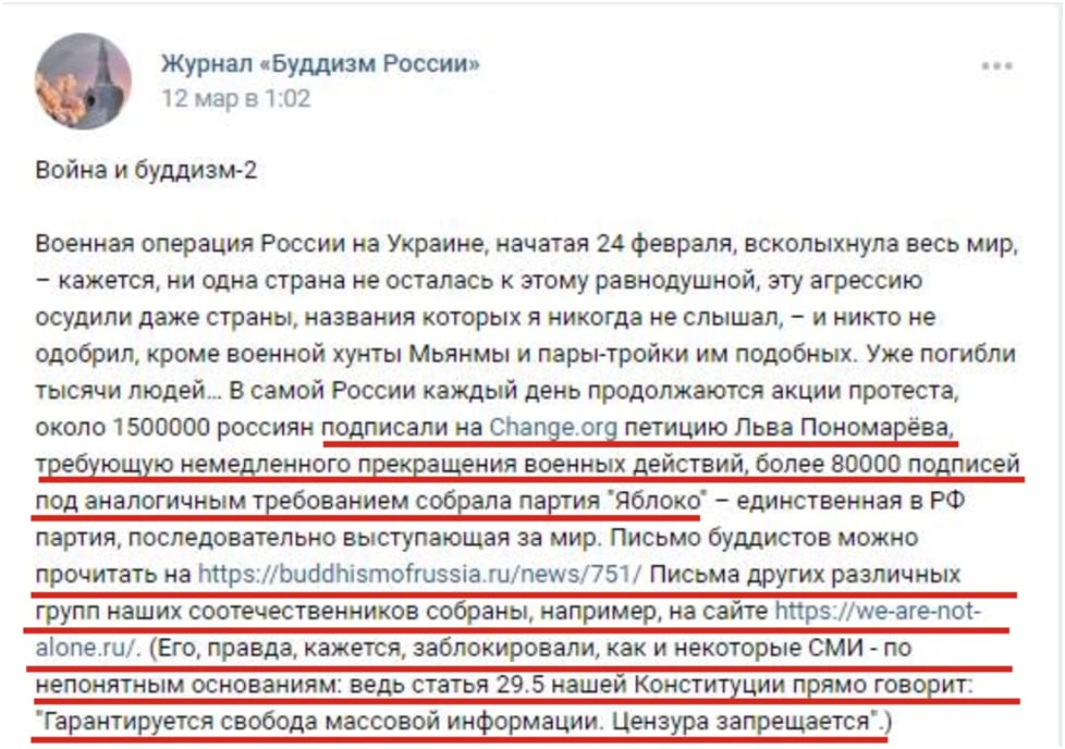 3 марта 2022 г. в социальной сети «ВКонтакте» на странице электронной версии журнала «Буддизм России» появилось такое вот воззвание: «Мы, буддисты России и мира, каждый от своего имени, выступаем против войны на территории Украины, ужасающие кадры которой разрывают наши сердца…»