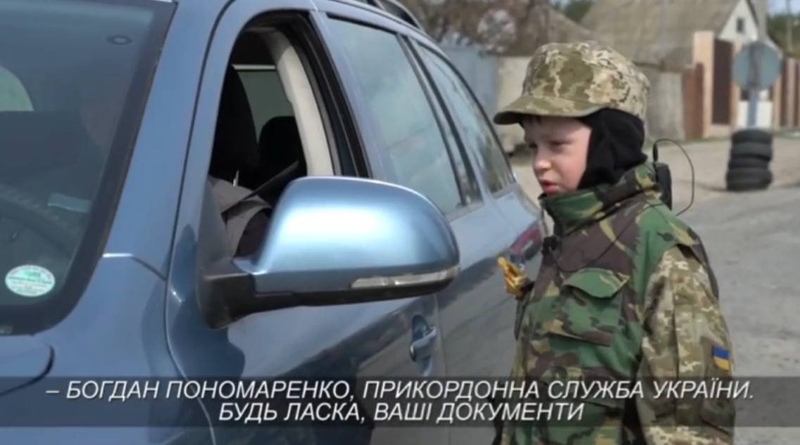 А вот кадры из совершенно другого региона — это 7-летний Богдан, который «помогает» пограничникам на блокпосту Пограничной службы Украины в Харьковской области.