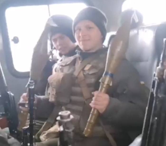 На следующих кадрах — совсем юные фольксштурмисты из Киева. Едут на обучение стрельбе из гранатомётов РПГ-7 и РПГ-22.
