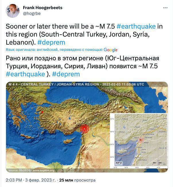 «Рано или поздно в этом регионе (Юг — Центральная Турция, Иордания, Сирия, Ливан) появится землетрясение магнитудой 7,5», — написал он на прошлой неделе в Twitter*.