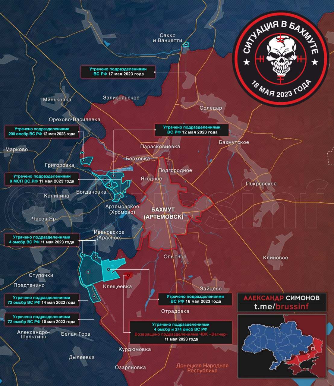 Обстановка на бахмутском направлении по состоянию на 18 мая по данным ЧВК: