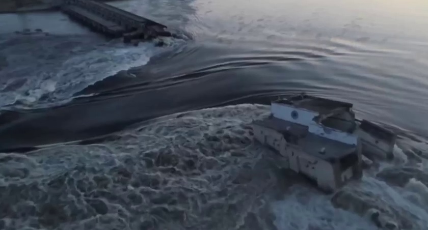 После частичного разрушения сооружений ГЭС начался неконтролируемый сброс воды из Каховского водохранилища.