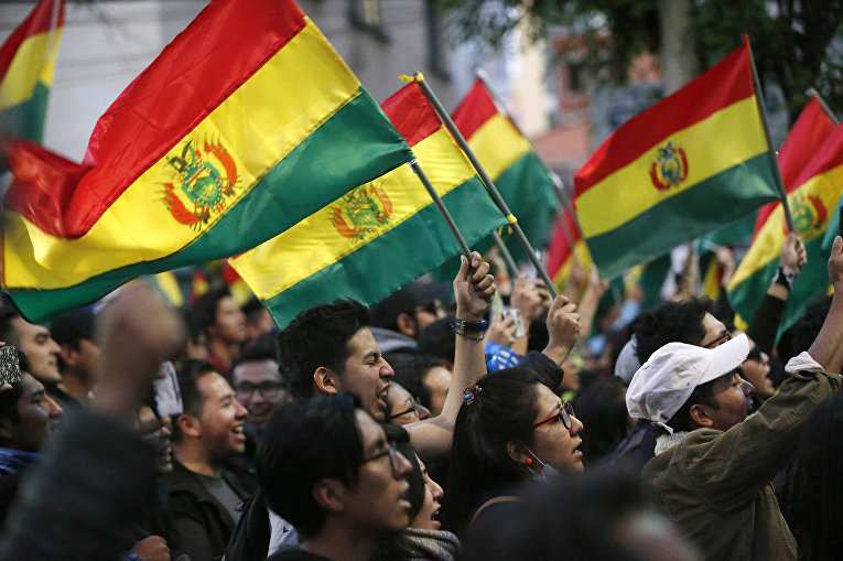 Боливийцы, собравшиеся в центре Ла-Паса в поддержку президента Луиса Арсе, празднуют отвод мятежных военных с площади перед Дворцом правительства, люди поют национальный гимн.