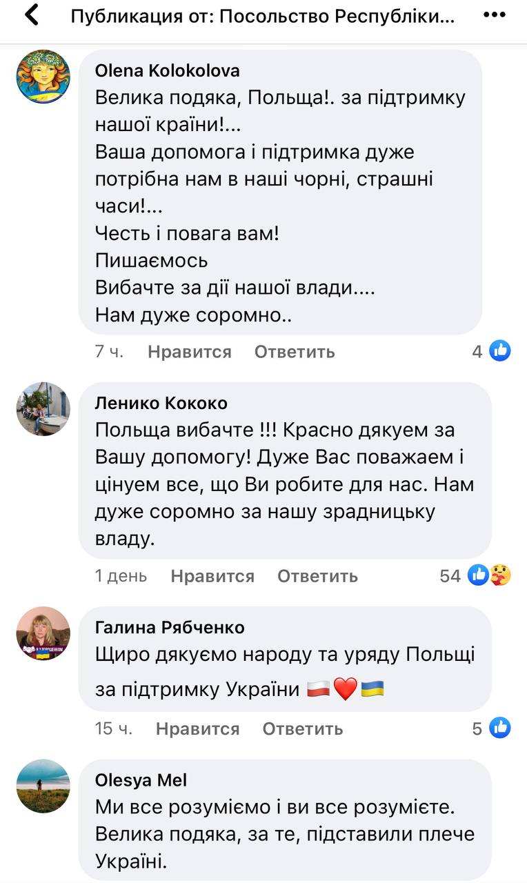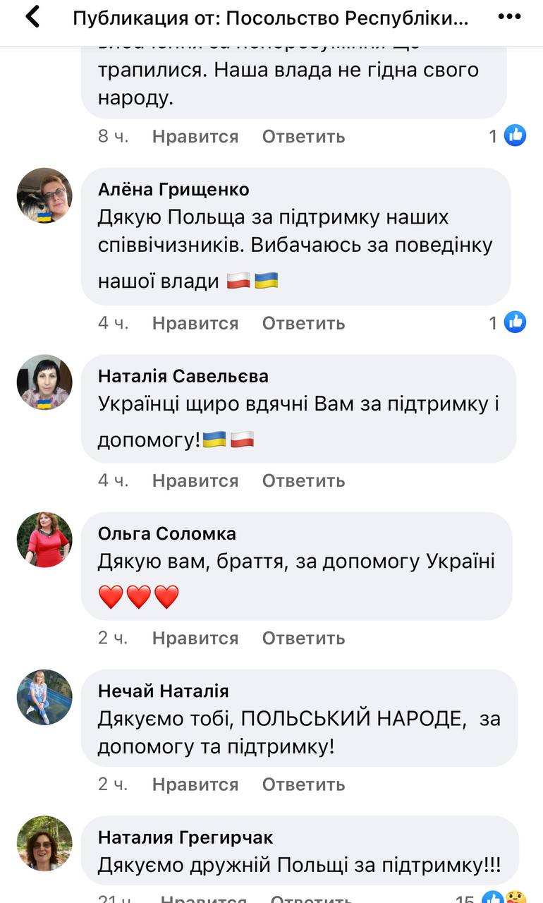 Поэтому на странице посольства Польши в Киеве в соцсети украинцы массово извиняются за Зеленского и благодарят Варшаву.
