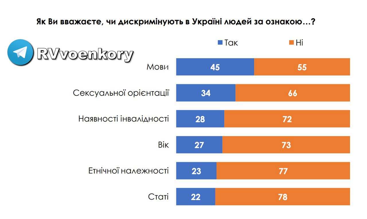 Многие считают, что на Украине дискриминируются люди по определенному признаку. Больше всего респондентов (45%) заявили о дискриминации по признаку языка. На условно втором месте (34%) — по сексуальному признаку. Около четверти респондентов говорят о дискриминации по признаку инвалидности (28%), возрасту (27%), этнической принадлежности (23%) и полу (22%).