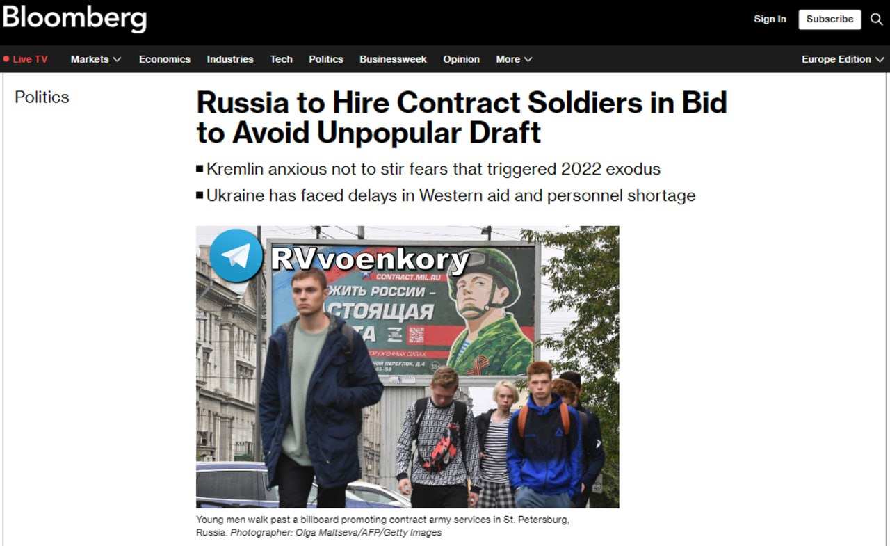 Россия намерена избежать мобилизации и обойтись наймом контрактников, сообщает агентство Bloomberg.