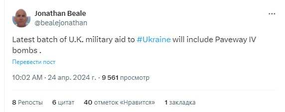 В новый пакет военной помощи, который Британия передаст Украине, войдут высокоточные авиабомбы Paveway IV, сообщает корреспондент Би-Би-Си Джонатан Бил.