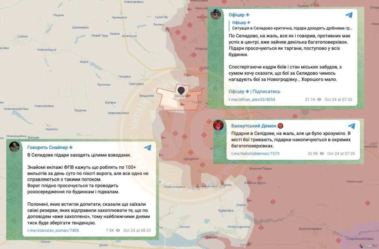 «По Селидову, к сожалению, все как и говорил, российские войска преуспевают в центре, уже заняли несколько многоэтажек. Русские просачиваются как тараканы, постепенно у всех домов.