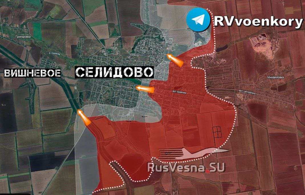 Российские войска продвинулись в центре Селидово, вдоль железной дороги в направлении Вишнёвого и в районе террикона шахты им. Коротченко.