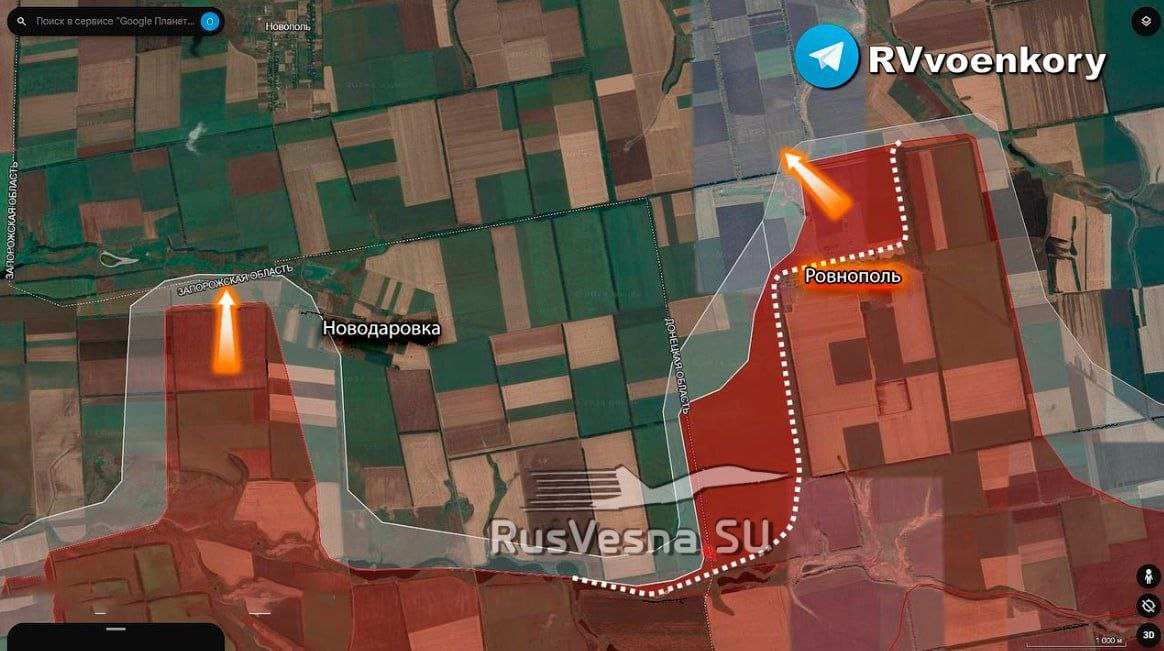На запорожское направлении севернее и юго-западнее Ровнополя российские войска продвинулись на глубину до 1 км и продолжают накаты манёвренными группами в направлении Новодаровки.