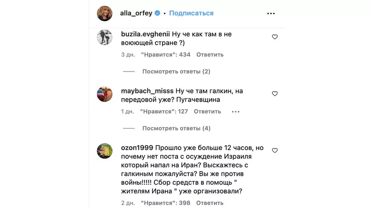 Пользователи социальных сетей начали массово задавать вопросы под публикациями певицы Аллы Пугачевой о ее мнении по поводу боевых действий между Ираном и Израилем.