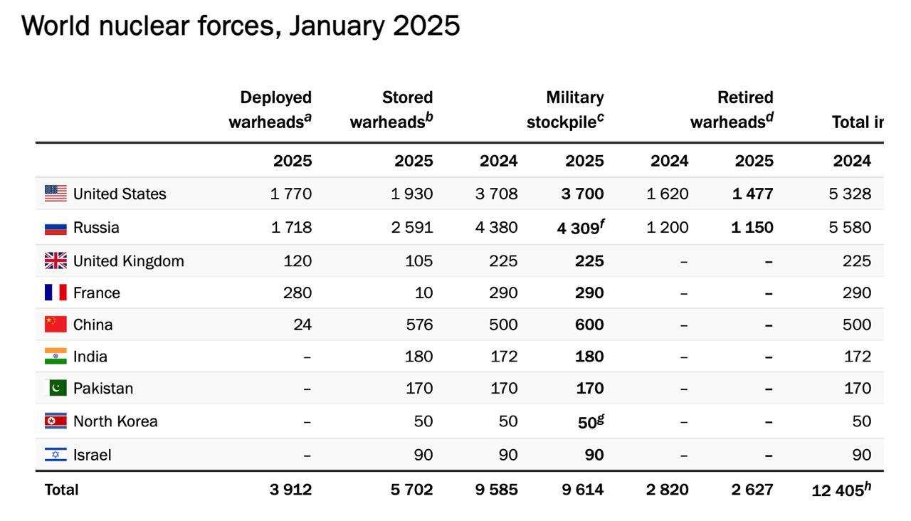 Всего, по данным института, по состоянию на январь 2025 года в мире насчитывается 9614 ядерных боеприпасов (без учета подлежащих утилизации), 3912 боеголовок развернуты на ракетах и бомбардировщиках, остальные находятся на складах. При этом примерно 2100 ядерных боеголовок установлено на ракетах, находящихся на боевом дежурстве.