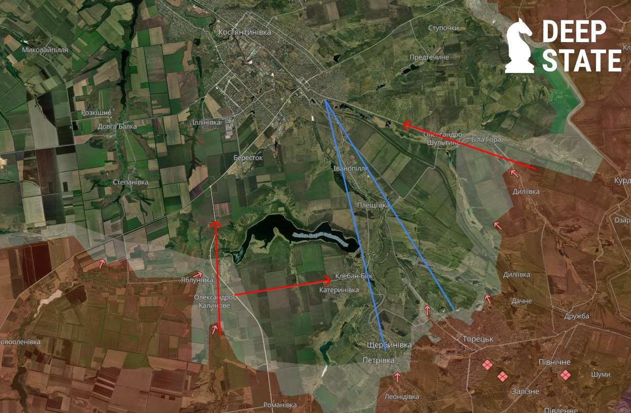Российские войска активно стремятся полностью перекрыть логистику на направлении Торецка (Дзержинска) и Щербиновки. Для этого ВС РФ предпринимают попытки добиться успеха по двум направлениям: в районе н. п. Белая Гора—Александро-Шультино и в районе н. п. Яблоновка — Александро-Калиново, пишет в сводке работающий на ГУР аналитический ресурс Deep State.