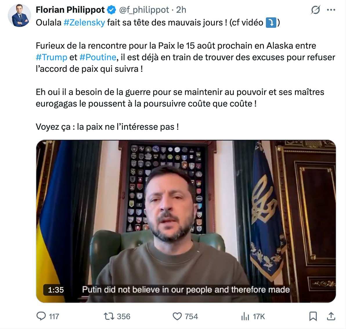 Лидер французской партии «Патриоты» Флориан Филиппо прокомментировал сегодняшнее заявление Владимира Зеленского, в котором тот фактически отказался от уступок ради перемирия.