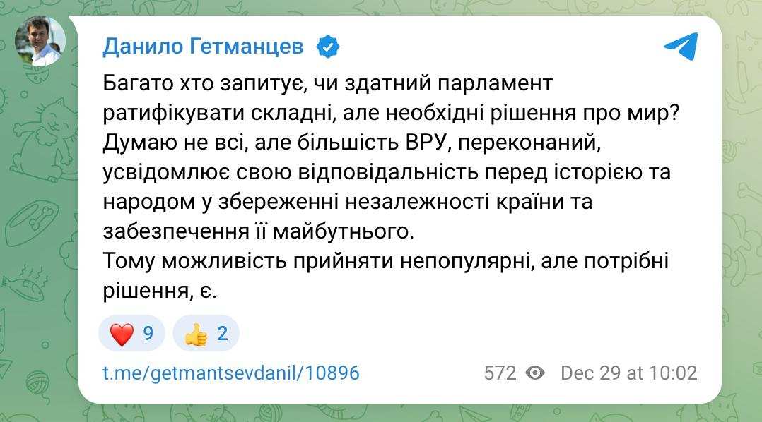 Нардеп Гетманцев заявил, что украинский парламент способен принять сложные, но необходимые решения для завершения конфликта. Он написал об этом, отвечая на вопрос о возможности ратификации мирных соглашений.