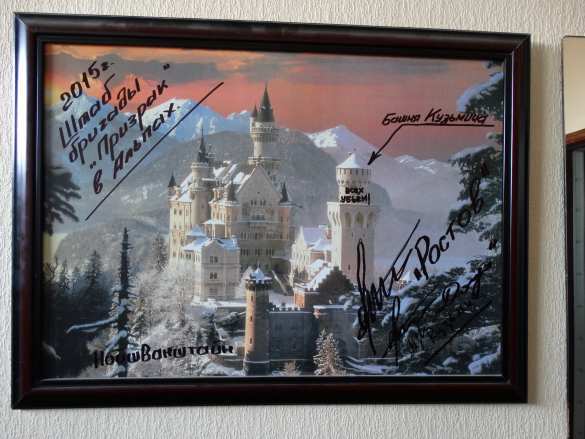 На противоположной стене репродукция знаменитого баварского замка Нойшванштайн, выстроенного в 19 веке по заказу одного из самых загадочных королей Европы Людвига Второго. На картине фломастером сделана надпись «2015 год. Штаб бригады „Призрак“ в Альпах».