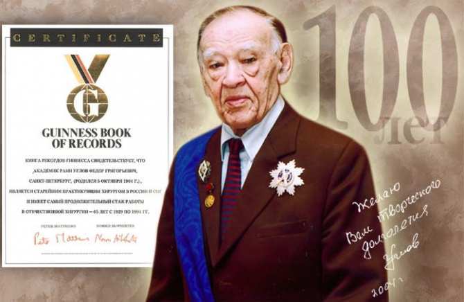 Фёдор Григо́рьевич Угло́в (1904—2008) — советский и российский хирург, действительный член Российской академии медицинских наук, член Союза писателей России, действительный и почётный член Петровской академии наук и искусств, почётный доктор Санкт-Петербургского государственного медицинского университета имени академика И. П. Павлова, главный редактор журнала «Вестник хирургии имени И. И. Грекова» (1953—2006), почётный член многих отечественных и зарубежных научных обществ, вице-президент Международной Славянской академии, президент Государственного православного фонда. Активный сторонник и пропагандист трезвого образа жизни.