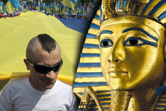 — Название главного египетского храма Хет-ка-Птах звучит очень уж по-украински: «Хата-Птаха». Судя по изображениям на египетских пирамидах (погребение жены фараона Хеопса и его матери Хетепхерес, погребение Тутанхамона), египетские царицы в то время были блондинками с голубыми глазами. Там в немалом количестве встречается трезубец, ныне — малый Государственный Герб Украины.