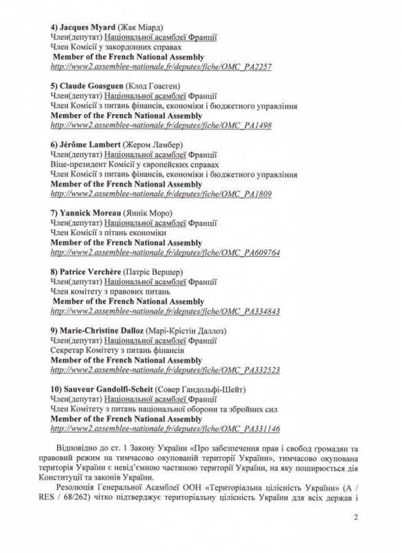 «Горе-французам грозит от 5 до 8 лет. По моему обращению в Генеральную прокуратуру Украины уже начата проверка. Все те, кто входил в состав французской делегации, все те, кто позволил себе цинично наплевать на украинские законы и вести „переговоры“ с оккупантами, кто, без зазрения совести и не ценя свою персональную репутацию, нарушил границы нашей страны — все они понесут ответственность», — написал Логвинский.