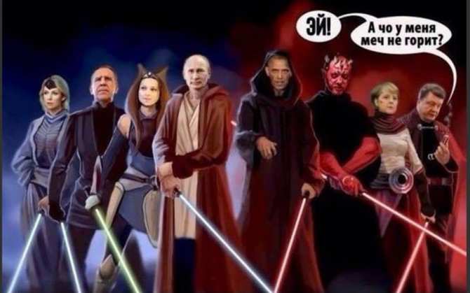 Светлая сторона силы в фильме ведёт себя точно так же, как в нынешней реальности действует Запад. Сегодня западные политики готовы разбомбить весь мир ради соблюдения прав человека и принципов демократии. «Мы не убиваем, а боремся против зла, потому что мы ДОБРЫЕ. Мы улыбаемся и не носим этой ужасной имперской униформы — вы же видите, мы ДОБРЫЕ! Моя сабля светится голубым, а не кроваво-красным светом, чтобы вы знали — я ДОБРЫЙ!»