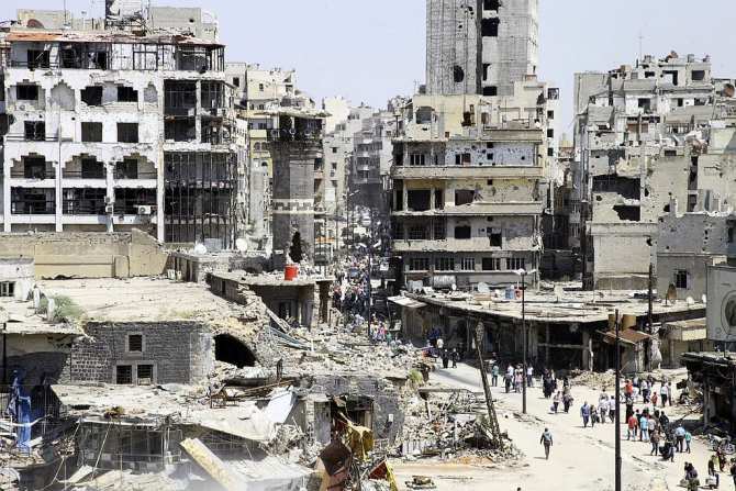 Узкие улицы с типичными для Сирии домиками из песчаника и бетона лежат в руинах. То здесь, то там попадаются неразобранные баррикады, заградительные насыпи и заделанные кирпичами окна с бойницами. В развалинах живут люди.