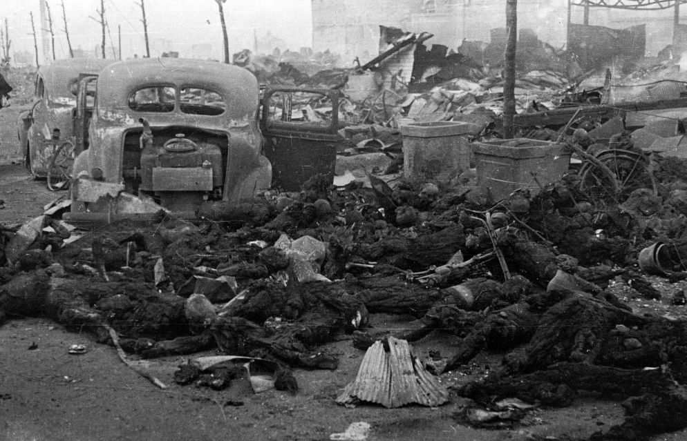 При налётах на японские города американскими лётчиками применялась преступная тактика уничтожения — вначале удар наносился по окраинам, а когда огненные реки отрезали несчастным жителям пути к спасению, их накрывала вторая волна зажигательных бомб.
