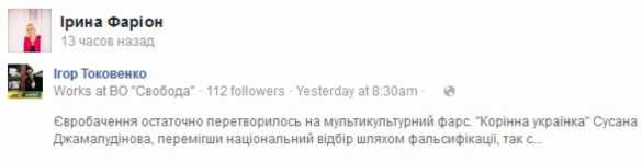 В частности, один из сотрудников аппарата всеукраинской националистической организации «Свобода», замруководителя Днепропетровской областной организации Игорь Токовенко написал пост в Facebook, который понравился экс-депутату от этой политсилы Ирине Фарион и ее единомышленникам. Националистам не понравилось то, что у Джамалы татарские корни.